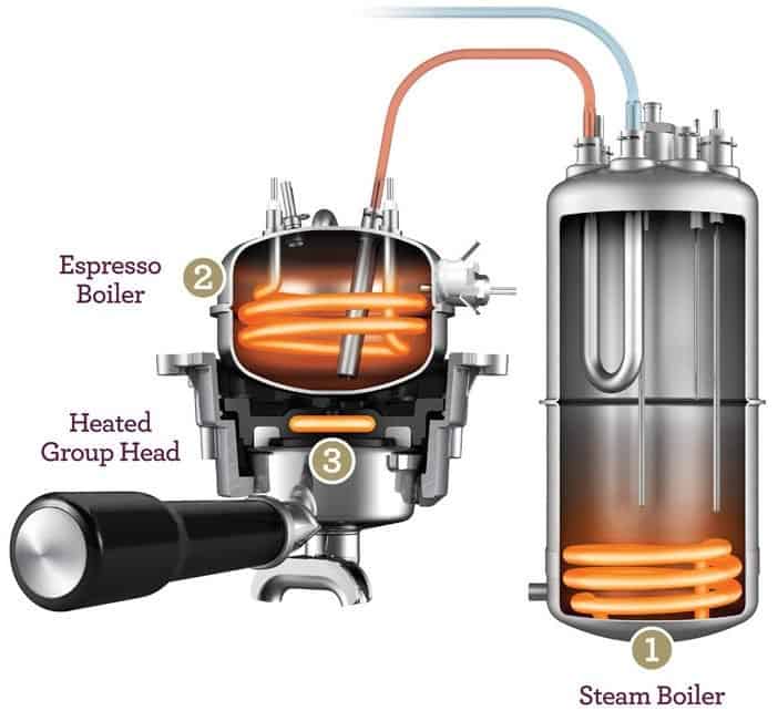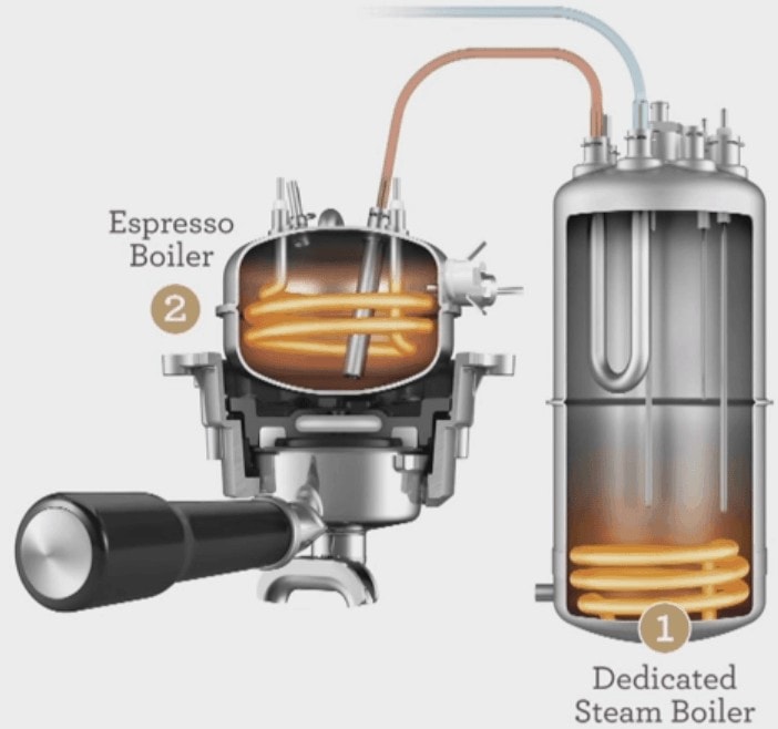 The temperature control is very important when preparing an espresso or a cappuccino. Breville’s triple heat system is a patent-pending innovation that addresses this. Triple heat means that instead of using one heating element for steaming, brewing, and brew-head, we have three separate heating systems. Each of the systems works separately because they need different temperatures. Here is how they implemented the triple heat system.