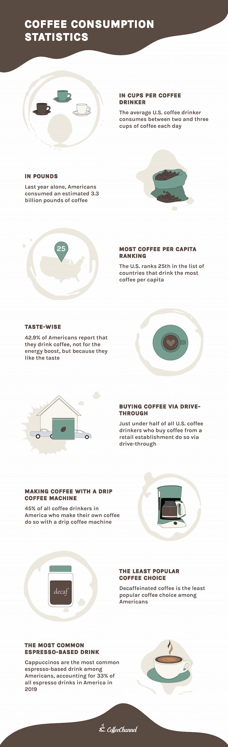 The average U.S. coffee drinker consumes between two and three cups of coffee each day (Statista)