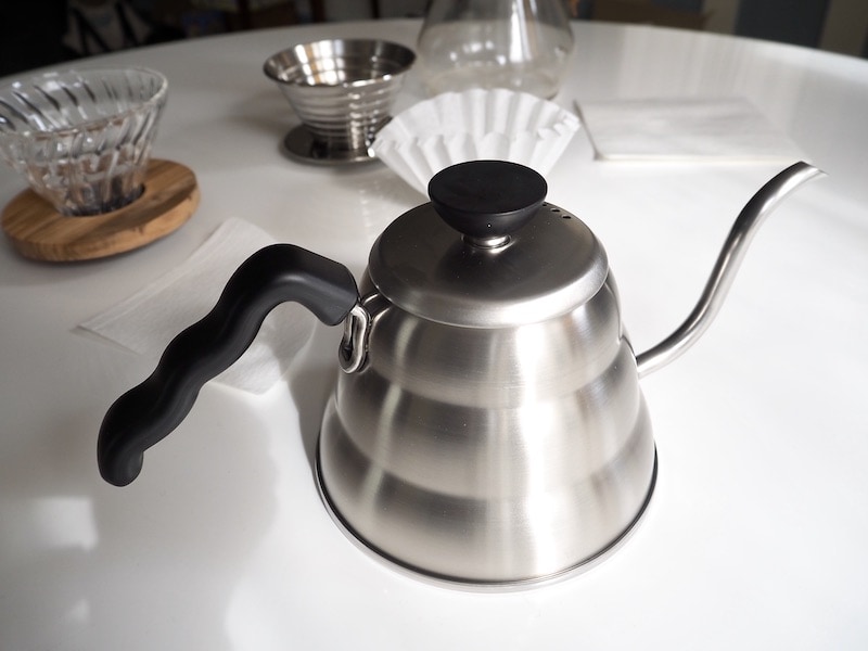 Using a gooseneck kettle if you have one, bring water to a boil. Then let it sit for a minute or two. This will let it cool down to the best temperature for pour-over coffee, which is between 195 and 205° Fahrenheit.