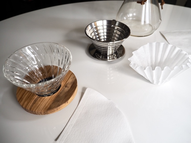 From left to right: Melitta pour-over, Hario V60, Kalita Wave, and Chemex