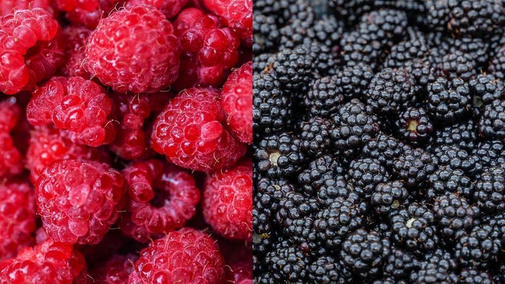 While they are related, raspberries and blackberries have some differences. Raspberries are a bright and vibrant reddish color, whereas blackberries are an intensely deep purple-black color. They are notably sweeter compared to blackberries, which have a stronger tart flavor. Raspberries are also “hollow” after being picked and the inner core stays on the branch, but blackberries retain the core after being harvested.